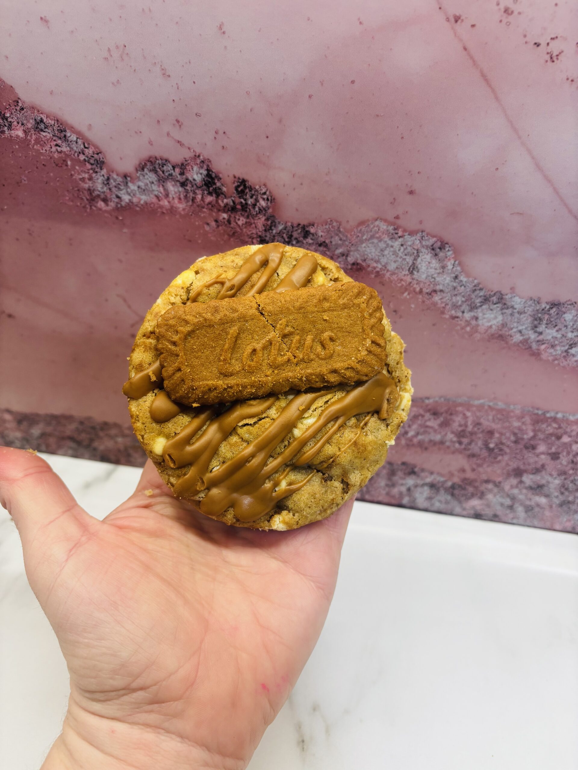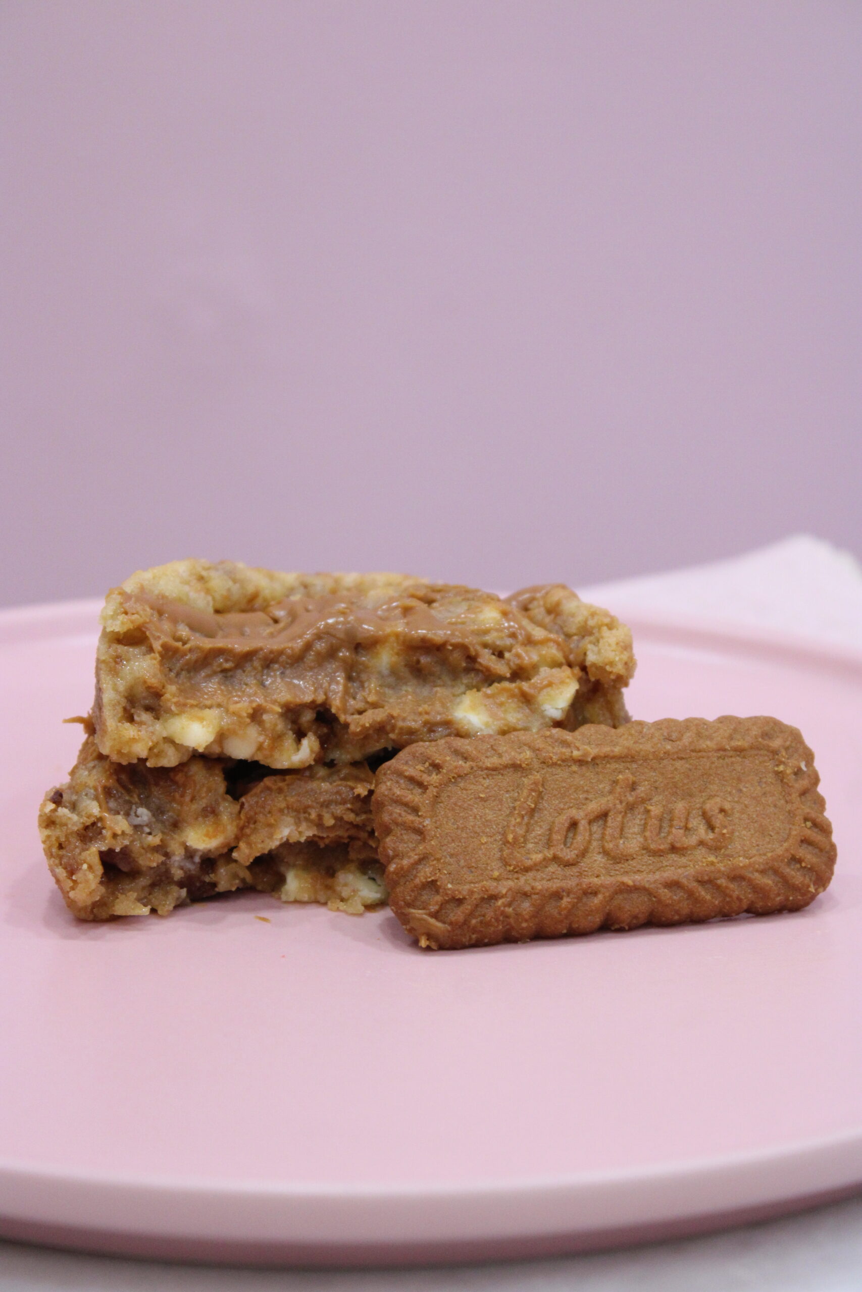 Ingrédients clés : Farine, Mélanges de sucres pâtissiers, Beurre AOP, pépites blanches, spéculoos®, cœur pâte spéculoos®.